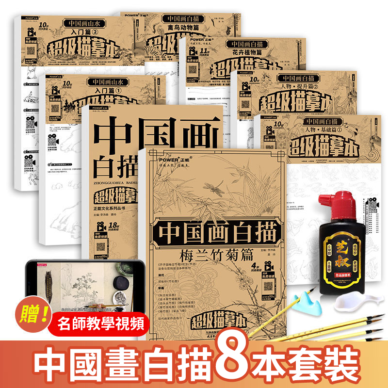 【贈視頻教程+國畫毛筆+一得閣香墨汁+墨碟】國畫8冊 山水 人物 花卉 禽鳥 梅兰竹菊 套裝淺印慢描,輕鬆掌握100種國畫技法,快速掌握經典筆法,技巧,控筆!