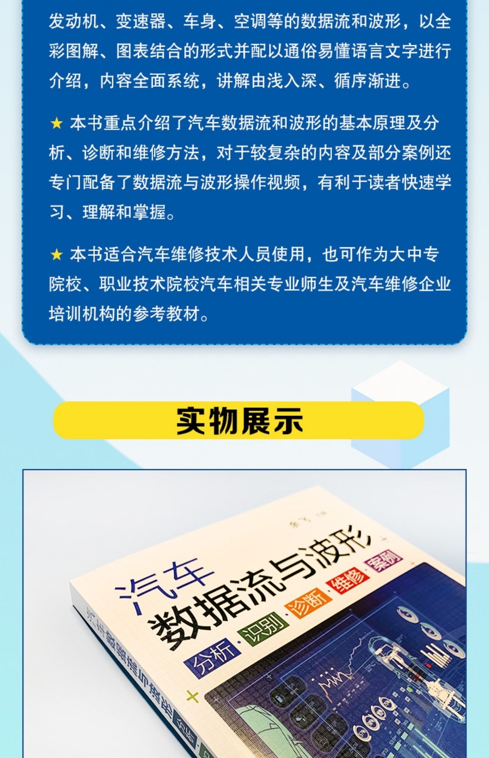 本書重點介紹了汽車數據流和波形的基本原理及分析、診斷和維修方法,對於較複雜的內容及部分案例還專門配備了數據流與波形操作視頻,有利於讀者快速學習、理解和掌握。