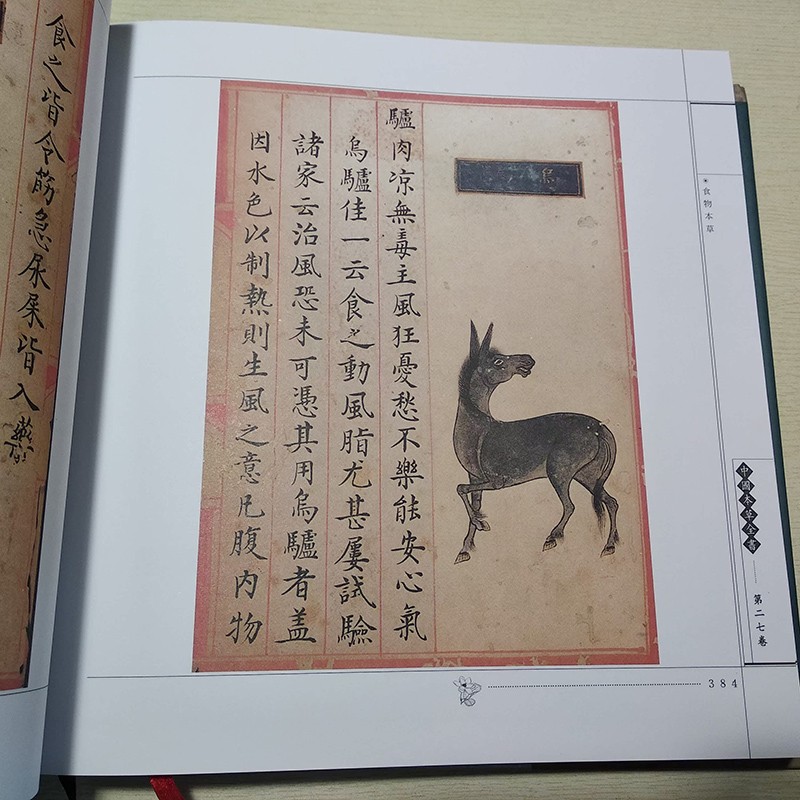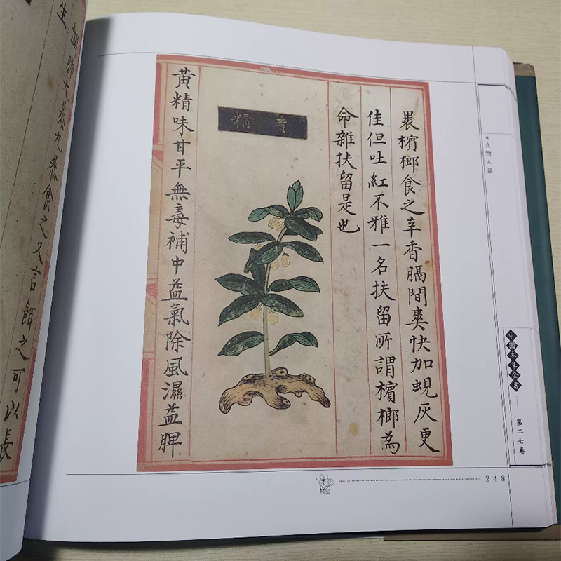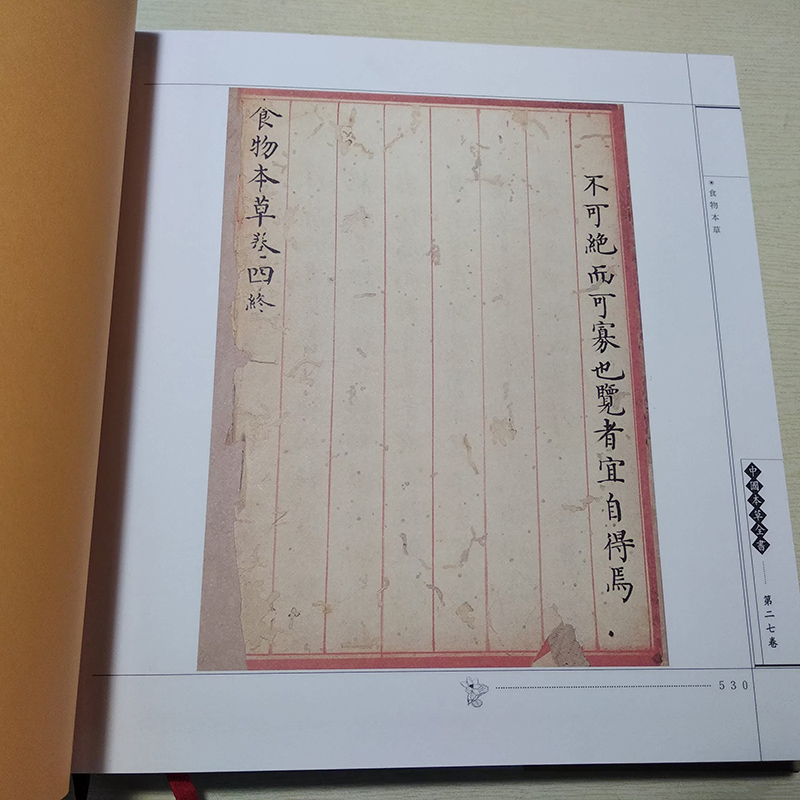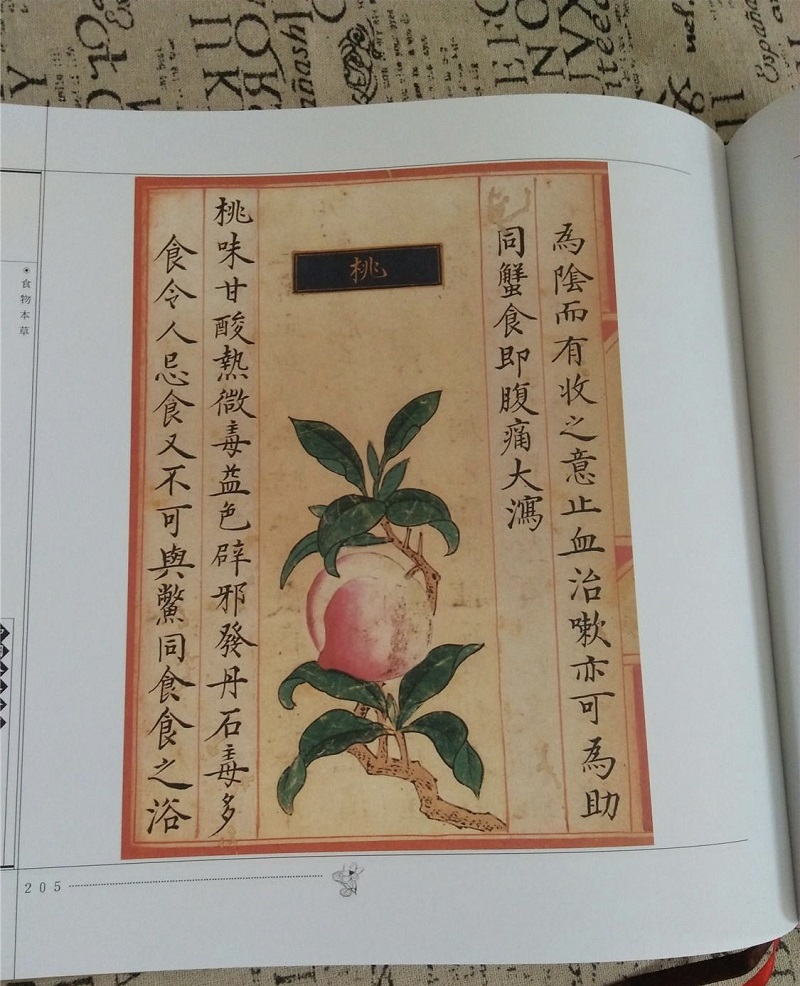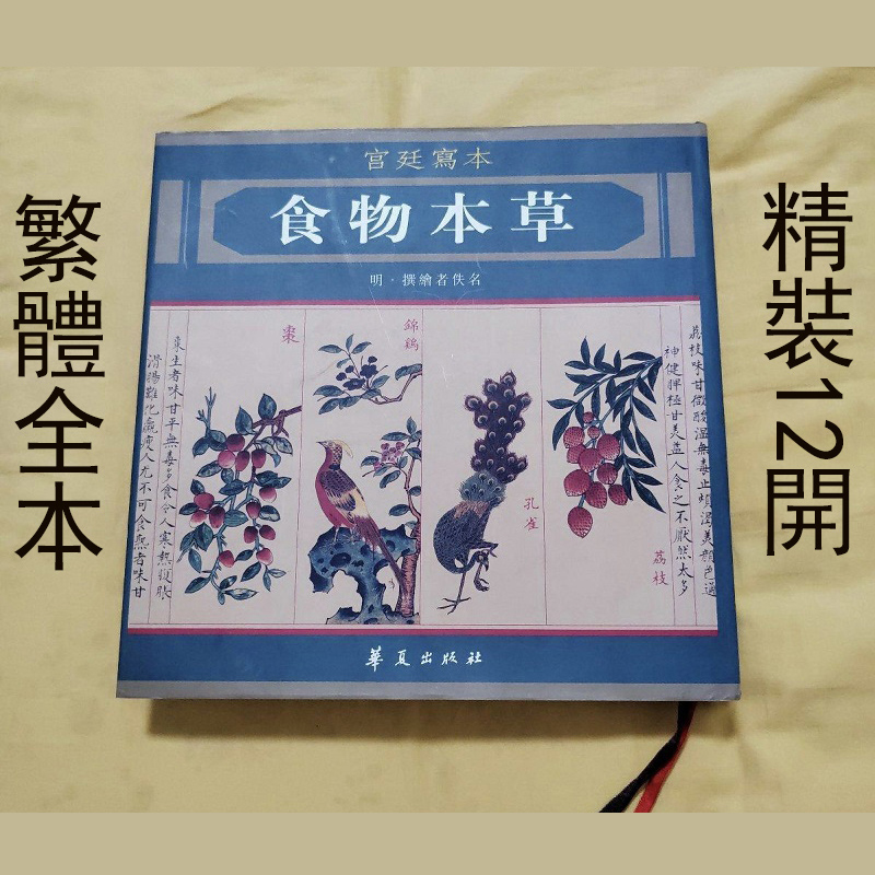 《食物本草》彩繪本,據考證為明朝宮廷寫本 ,乃太醫院奉旨整理撰寫,並由宮廷畫師親自繪製。它因受當時突發事件的影響而未能刊印,此影印本為其首次出版發行,盡現原書原貌,版本極其,且裝幀考察,獨運匠心,中式十二開本,。