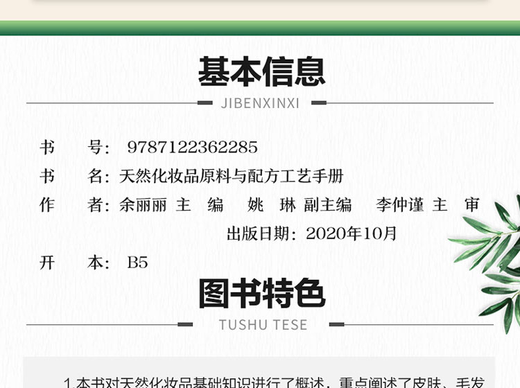 2.本書能夠幫助讀者快速建立對化妝品的基本概念、生產工藝過程和功能化原料的認識,方便對天然化妝品的工藝和配方進行選擇和進一步開發研究,也可指導讀者解讀化妝品中天然組分的功效,幫助廣大讀者選擇合適的化妝品;