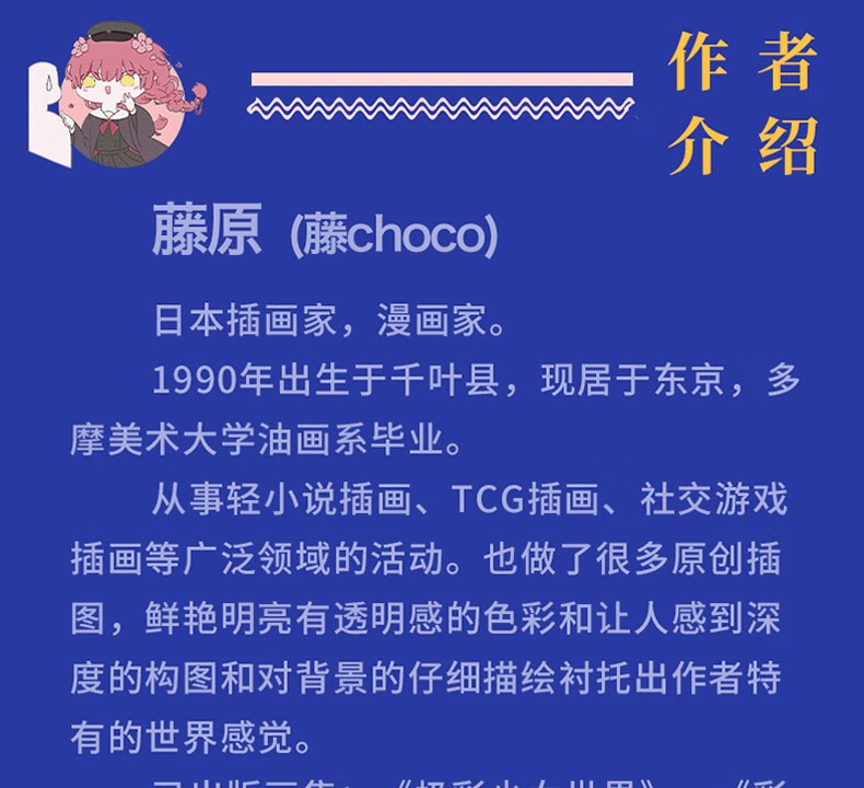 《藤色之夏:藤CHOCO畫集》作為藤原代表性的全/新畫集,收錄150餘幅經典插畫,含30餘幅新繪製作品,帶領我們走進一個充滿幻想與色彩的世界。每一幅畫作都在光影間流淌,場景奇幻動人,人物形象栩栩如生,展現出強烈的個人風格與藝術價值。