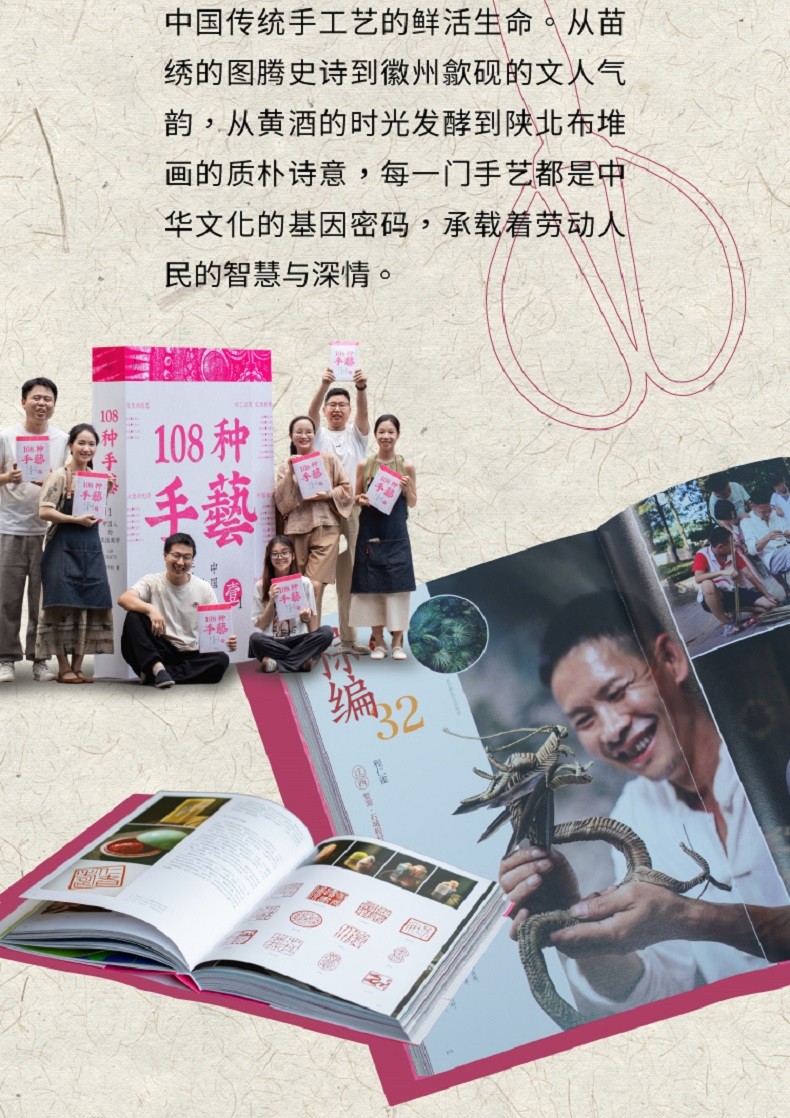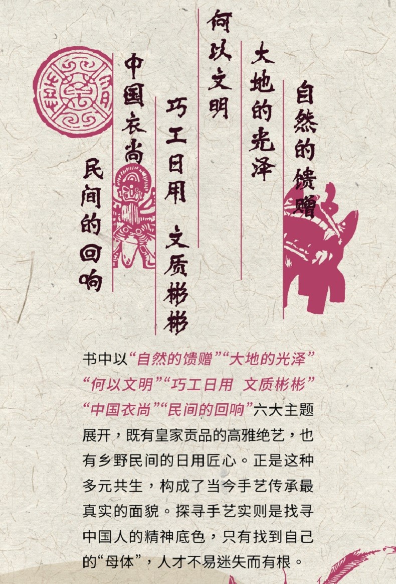 《大美非遺:108種手藝》共分三輯,通過尋訪108位手藝人,展示了108種涵蓋了從傳統到現代的多種技藝,如苗綉、木雕、鈞瓷、古法造紙、制筆、油紙傘等,展現了中國人民的智慧和創造力。通過本書,可以讓讀者領略到非遺文化中凝聚着中華民族深層次的文化基因,是人類生命的記憶,是人類創造力的精神源泉,是人類智慧的結晶,是人類永恆的精神家園。