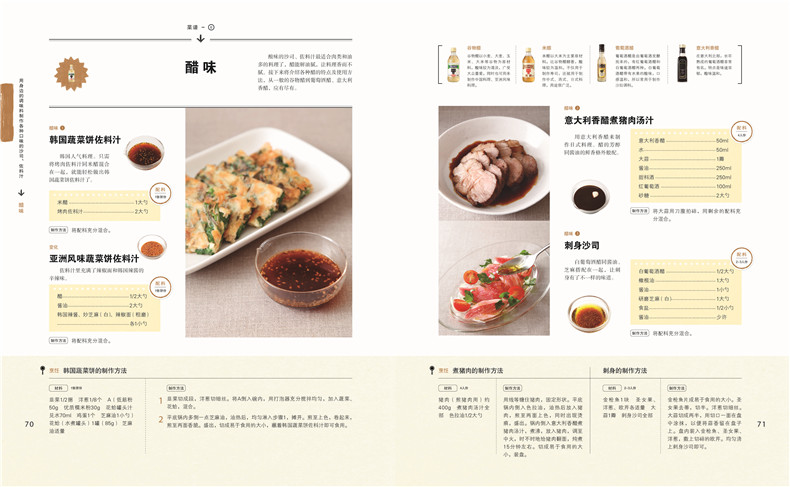 精選多國經典醬汁醬料,包括法國、意大利、日本、中國韓國和越南的地道配方,在經典配方基礎上又發散出多種變化搭配,為傳統料理增色,激發廚房創意。西餐的紅酒醬汁、油類醬汁、日本的味噌調料、韓式辣椒醬等,都有單獨分類,並全面收錄細分品種,方便查找。 201種醬汁料理製作步驟清晰完整,適合餐廳、酒吧、居酒屋、咖啡廳的各位店主參考使用。