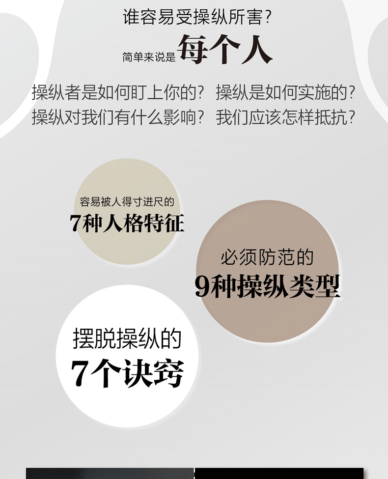 這導致了很多人際關係噩夢的基本形式——情感勒索。勒索者抓住受害者的恐懼感、責任感和罪惡感,雙方一起被困在惡性循環之中。福沃德對情感勒索的根源做了、深刻的分析,並對勒索者和受害者的類型做了歸納。一段關係之所以能墜入勒索的陷阱,是勒索者和受害者雙方的弱點共同造成的。而情感勒索看似以受害者讓步、勒索者滿足告終,實際上侵害了受害者的自我完整性,也讓勒索者的心態更加扭曲,關係中的問題依然沒有得到解決。她告訴我們,面對情感勒索時,如何應對才是正確的,我們可以通過一些簡單的訓練學會擺脫情感勒索的方法。 *重要的是:擺正立場,堅定信心。
