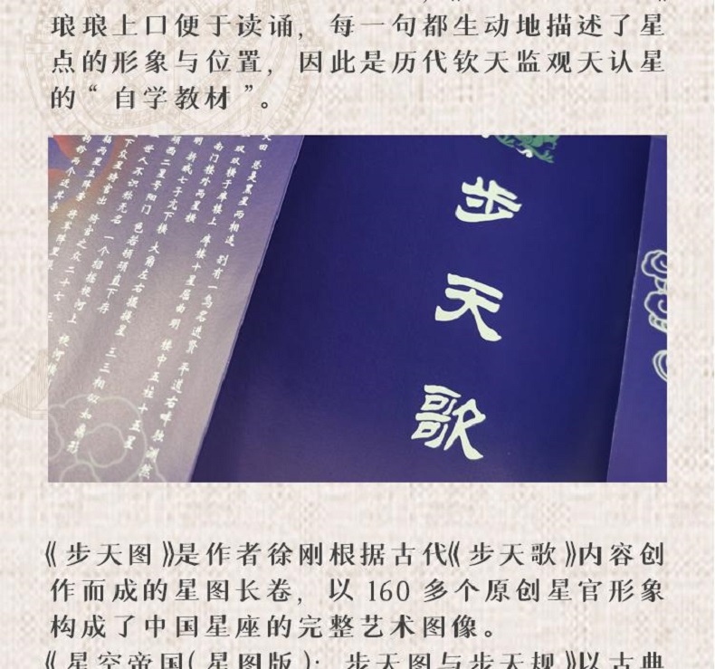 本書以吟誦中國星象的《步天歌》為線索,配以作者創作的中國星官形象,透過圖解的形式向讀者揭示了中國古代星官體系的秘密。書中涵蓋了歷史典故、詩詞歌賦、書畫碑拓等中國有的文化元素,又融合現代天文知識,既飽含文化色彩,又不失科學性、趣味性和生動性,是一部科普與人文相結合的佳作。