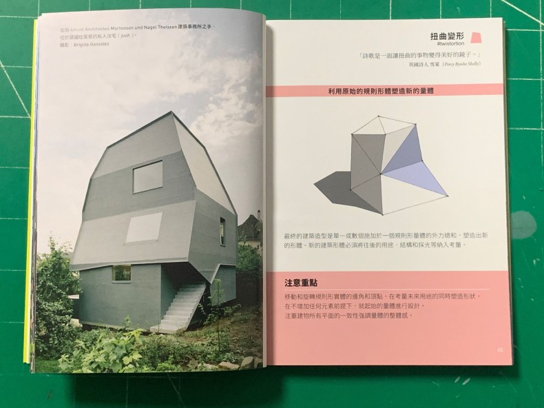 全書藉由圖示與實體縮小模型逐步解說當代空間構成的方法如折疊平面或結合曲線的設計。每一章開頭都以世界公認現存的知名建築為例做解說,讓讀者更清楚了解應用方式與成果。