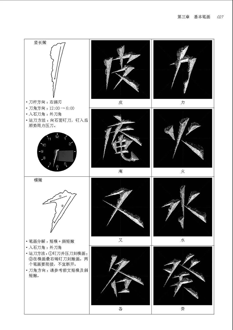 從放大的刀痕即可輕鬆判斷入刀的角度、方向及輕重等運刀要素。書中所選範字,從漢字的偏旁結構入手,將各類文字歸納匯總,使學習者能夠在熟悉範字的基礎上,舉一反三,迅速掌握單刀楷書的刻製方法。同時,將邊款中的紀年與常用字做了集中整理,方便直接學習與借鑒。可以說,它就是一本實用“邊款字帖”。