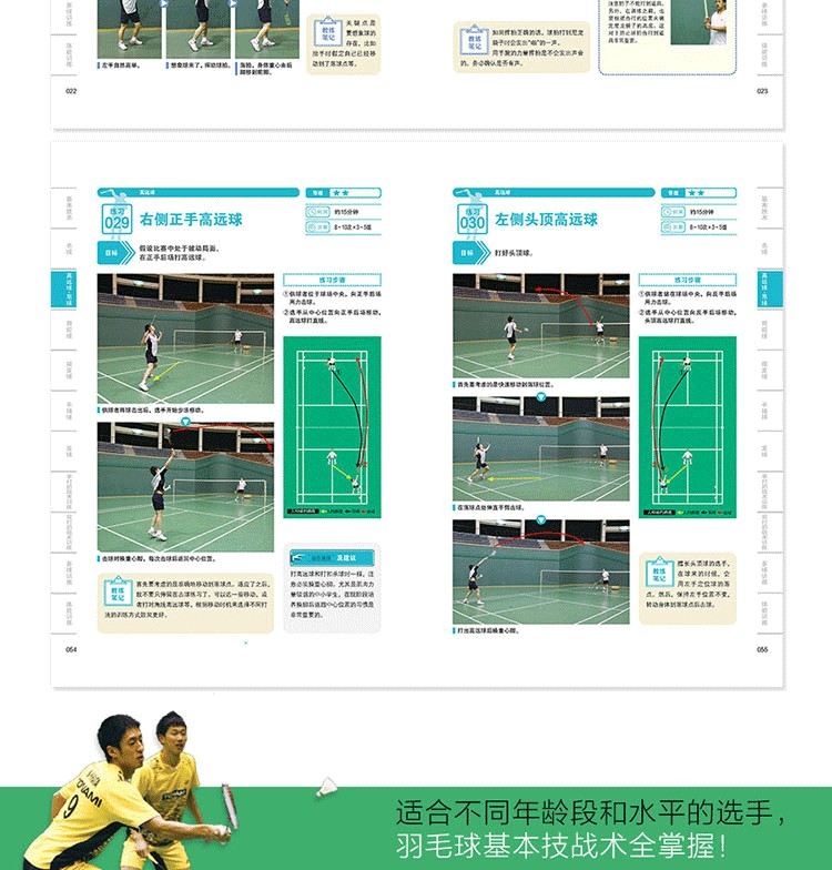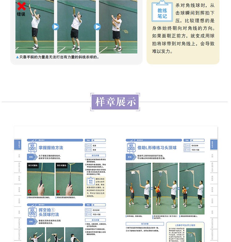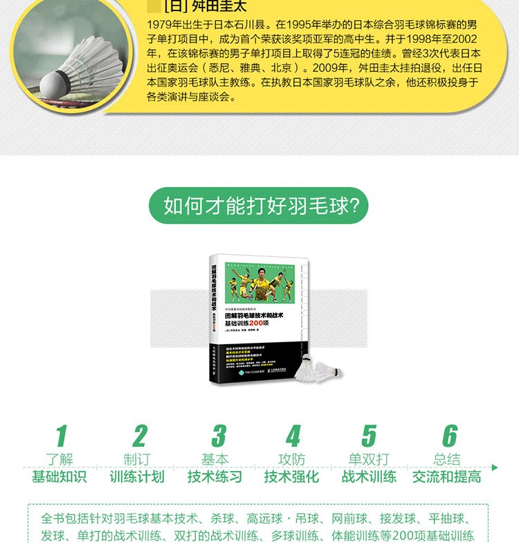 舛田圭太主編的《圖解羽毛球技術和戰術(基礎訓練200項)》是羽毛球基本技術和戰術的訓練攻略,全書包括針對羽毛球基本技術、殺球、高遠球·吊球、網前球、接發球、平抽球、發球、單打的戰術訓練、雙打的戰術訓練、多球訓練、體能訓練等200項基礎訓練項目,以及羽毛球訓練計劃的製訂方法;每項訓練又涵蓋目標、等級、練習步驟、教練筆記、動作要領及建議等內容,並以真人實拍照片、示意圖形式細緻講解每項訓練內容和訓練方法。本書適合從小學生到國家隊選手的所有羽毛球運動員和愛好者夯實羽毛球基本功,並有效提高他們的羽毛球技戰術水平。