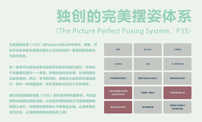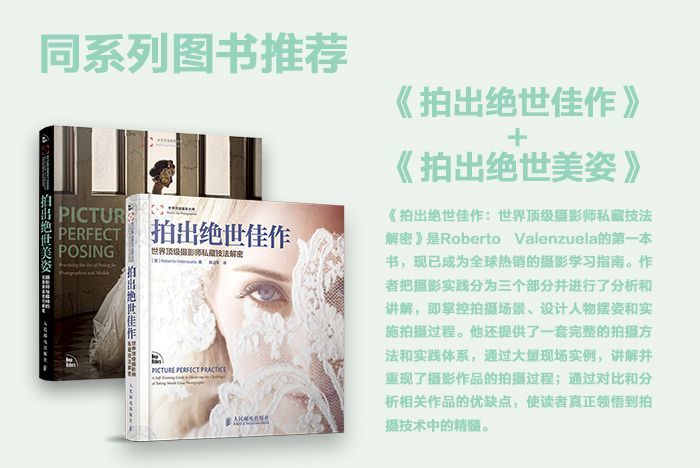 《拍出絕世美姿 攝影師與模特的**擺姿技巧解密》是具有“全球十大*具影響力的攝影工作者和攝影教育工作者”稱號的攝影暢銷書作家Roberto Valenzuela的*新力作,書中結合他多年的拍攝和教學經驗,以他自己總結的“**擺姿體系(P3S)”為框架,圍繞模特擺姿擴展出一系列模特擺姿要點與技巧。全書以影響擺姿的脊椎、重心和關節等元素為開篇,以面部、腰部、手肘、手臂為重點分析對象,分享不同的擺姿風格、表情表現方式、情侶擺姿訣竅等多方面的模特擺姿技巧。同時,本書還提供大量的人像攝影作品,提出問題,供讀者思考練習。