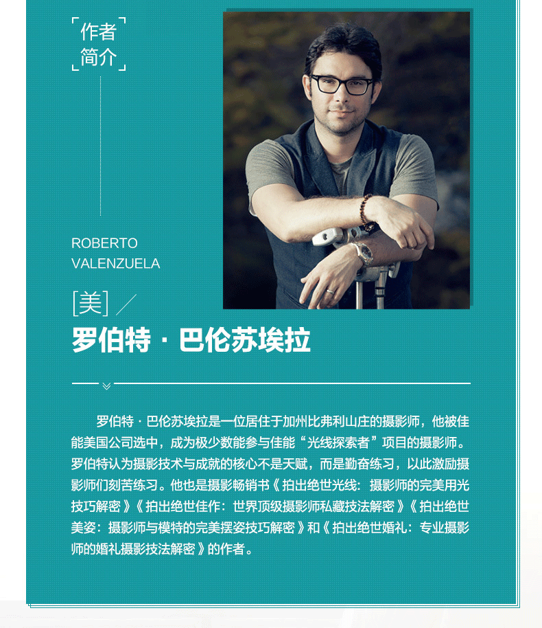 光是所有影像創作的根本。它是攝影的DNA。光可以把平淡的景物或人像變得無法言喻的美好。對大多數攝影師來說,攝影用光也是容易誤解和令人生畏的課題。這本書,就是為了讓攝影師學會駕馭光線而寫的。本書是具有“全球十大具影響力的攝影工作者和攝影教育工作者”稱號的攝影**書作家Roberto Valenzuela的新作,書中結合他多年的拍攝和教學經驗,以他自己總結的“五大光線特性”與“十大環境光元素”為框架,圍繞攝影佈光展出一系列攝影用光要點與技巧。全書分為五個部分。一部分,光的基礎知識:講述光的運作原理與光的五大特性。第二部分,環境光,探索十大環境光元素以及他們在攝影實踐中的運用。第三部分,輔助光,詳細講解反光板,柔光屏等輔助用光手段的使用技巧。第四部分,閃光燈的使用,極致詳盡地講述如何用閃光燈創造神奇光線效果。第五部分,光的視覺構思,詳解精選的典型用光案例,讓讀者從實戰角度理解光線的運用。本書適合攝影愛好者、攝影專業師生、人像攝影師、商業攝影師閱讀。