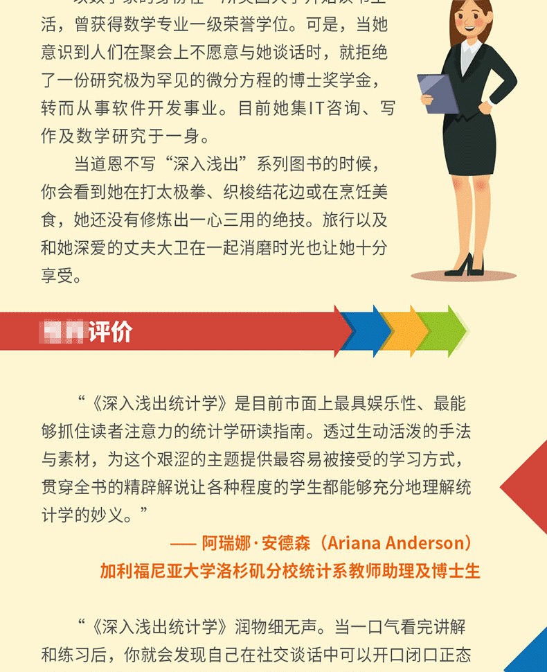 道恩·格里菲斯著的《深入淺出統計學》具有「深入淺出」系列的一貫特色,提供符合直覺的理解方式,讓統計理論的學習既有趣又自然。從應對考試到解決實際問題,無論你是學生還是數據分析師,都能從中受益。本書涵蓋的知識點包括:資訊視覺化、機率計算、幾何分佈、二項分佈及泊松分佈、常態分佈、統計抽樣、信賴區間的建構、假設檢定、卡方分佈、相關與迴歸等等,完整涵蓋AP考試範圍。本書運用充滿互動性的真實世界情節,教你有關這門學科的所有基礎,為這個枯燥領域的學習帶來鮮活的樂趣,不僅讓你充分掌握統計學的要義,更會告訴你如何將統計理論應用到日常生活中。
