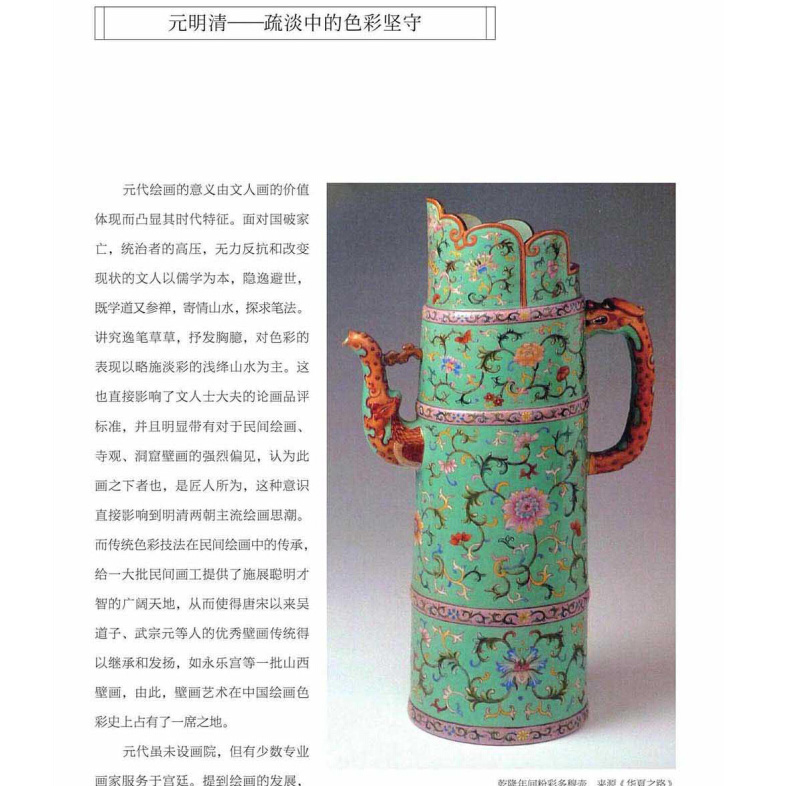 書中內容前半部分講述各種中國傳統顏料的特性及製作,兼及與現代顏料的對比;後半部分結合作者自己和當代十三位具有代表性畫家的繪畫創作,講述了顏料和工具材料的使用;最後梳理了中國重彩畫近幾十年的發展大事記。