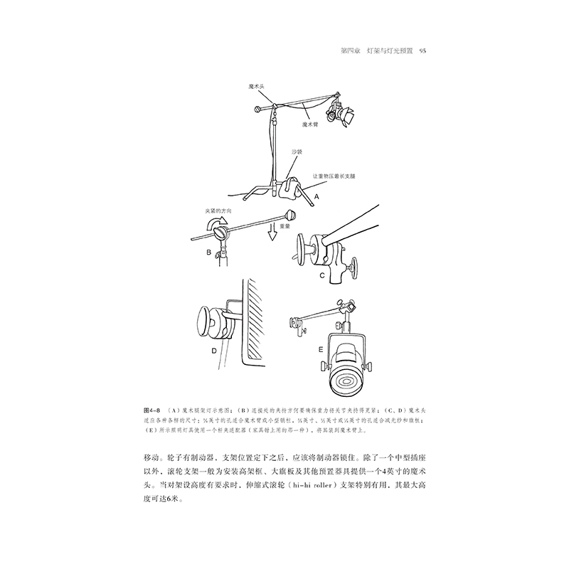 細緻講述基礎燈具的操作與配電,同時涉及氣球燈、特效燈、閃電燈、黑光燈等特種燈具,車拍、雨中拍攝、水下拍攝、綠幕拍攝等特殊拍攝環境,並對好萊塢片場的分工和行話進行了通俗講解。