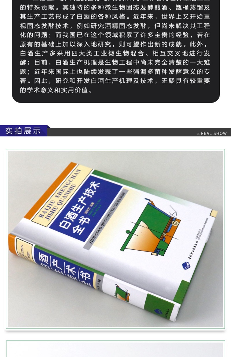 白酒生產多采用四大類工業微生物混合、相互交叉地進行發酵;目前,白酒生產機理是生物工程中尚未完全清楚的一大難題;近年來國際上也陸續發表了一些強調多菌種發酵意義的專著。 《白酒生產技術全書》研究和開發白酒生產機理及技術,無疑具有較重要的學術意義和實用價值。