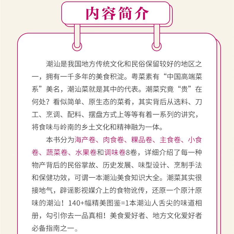 本書分為海產卷、肉食卷、粿品卷、主食卷、小食卷、蔬菜捲、水果捲和調味卷八卷,詳細介紹了每一種物產背後的民俗掌故、歷史發展、味型設計、烹製手法和保健功效,可謂潮汕美食知識大全。以100多道典型潮菜為切入點,探究美食與民俗、民智、情懷、情趣之間的關係,以風趣詼諧的語言描繪被時代浪潮所掩埋的潮汕飲食文化脈絡,教讀者品味潮菜的同時,更能夠知其所以然。對於想研究潮菜的廚者、甄別真假......