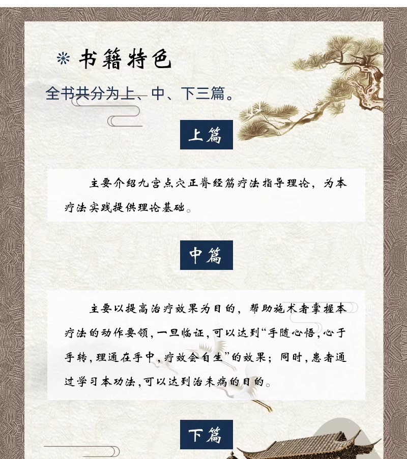 《九宮點穴正脊經筋療法(共2冊)》共分為上、中、下三篇。上篇主要介紹九官點穴正脊經筋療法指導理論,為本療法的實務提供理論基礎。中篇主要以提升治療效果為目的,幫助施術者掌握本療法的動作要領,一旦臨證,可以達到「手隨心悟,心於手轉,理通在手中,療效會自生」的效果;同時,病人透過學習本功法,可以達到治未病的目的。下篇是養生篇,從五運六氣和養生保健的關係,到日常保健養生之術,內容深入淺出,生動活潑,使老百姓了解養生,學會養生。全書有關治療的部分採用「網路+經筋療法」的創新模式,給治療影片配備二維碼,使讀者觀之簡潔明了。