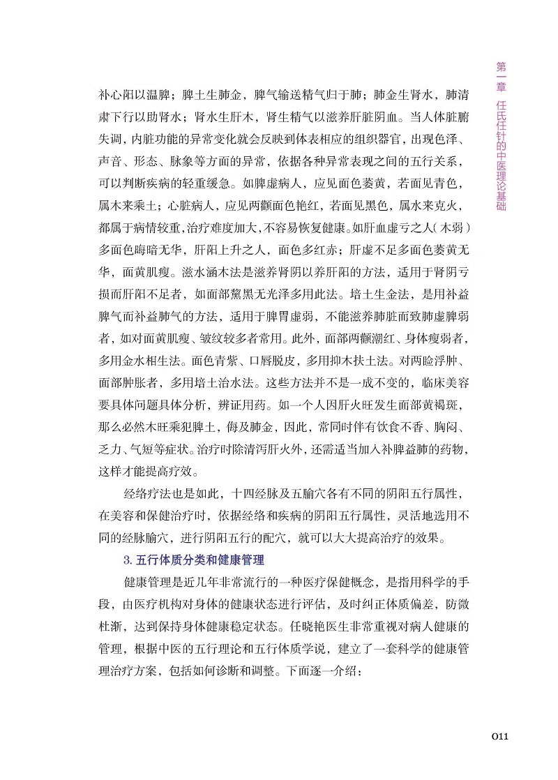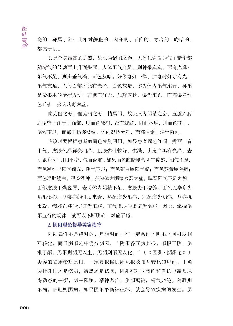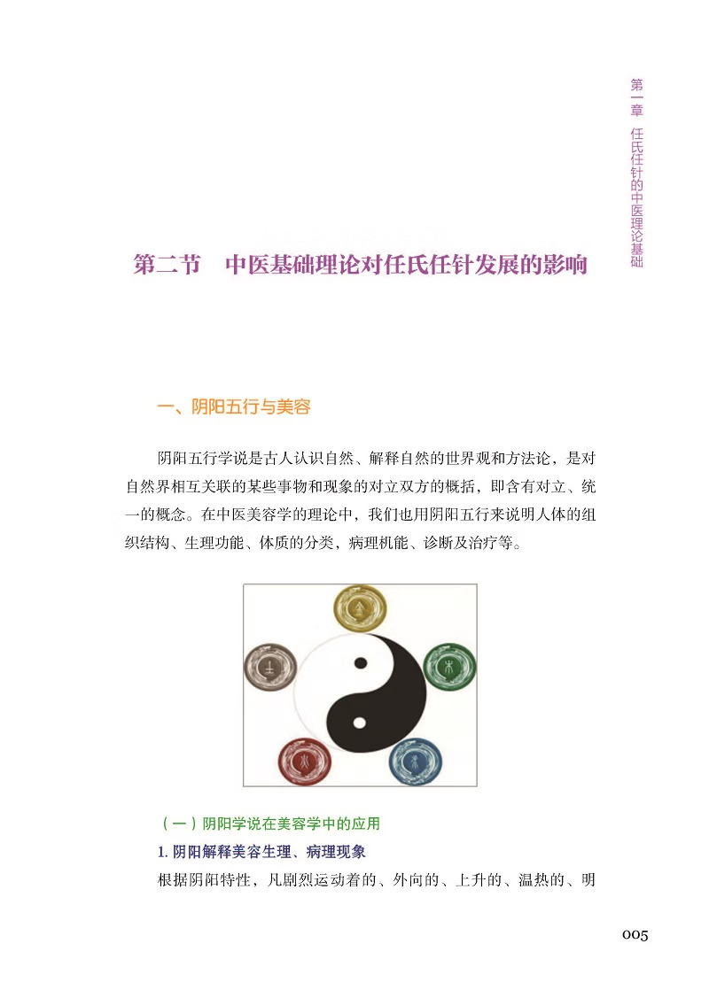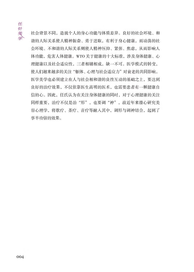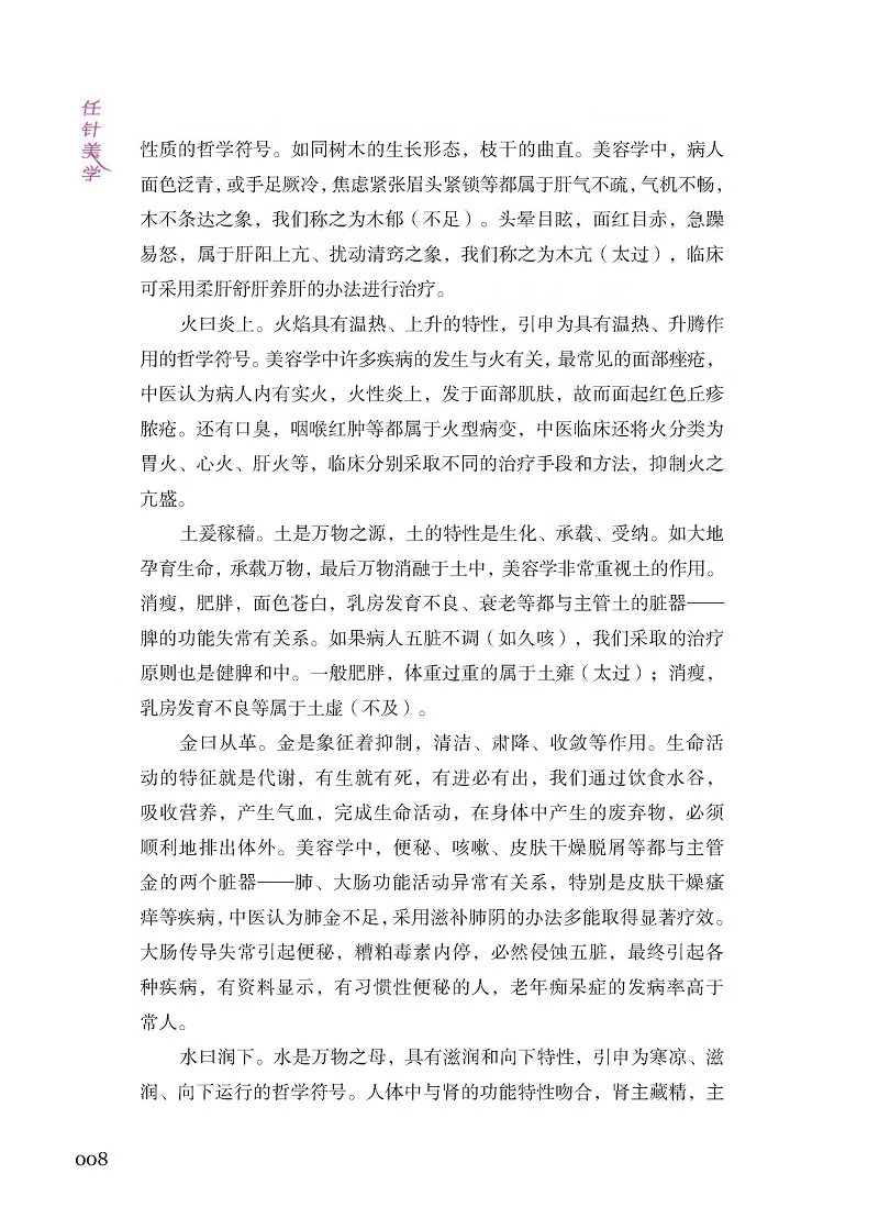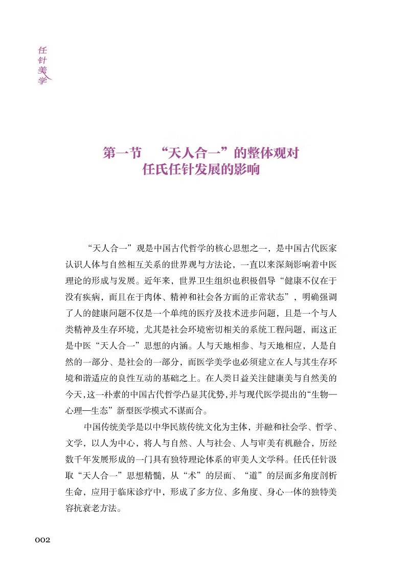 《任針美學》結了任曉艷博士30 餘年臨床經驗的一本美容、抗衰老臨床實踐指南用書。該書系統介紹了任氏抗衰老中的各種工具及操作手法,收集大量臨床中的損美性病症(如皺紋、面部鬆弛等)、損容性病症(如痤瘡、黃褐斑等)、損型性病症(如肥胖、富等)及女性產後修復(如盆底肌鬆弛、產後肥胖等)、乳腺(如乳腺增生、副乳等)等常見問題。對其發病原因、方行了詳細講解並配以大量圖片,讀者熟練掌握任氏針法技巧,以達到效果。本書具有較高的中醫醫學美容臨床實用價值,既可作為醫學院校教材或參考用書,又是廣大求美者美容抗衰老的實用讀本。