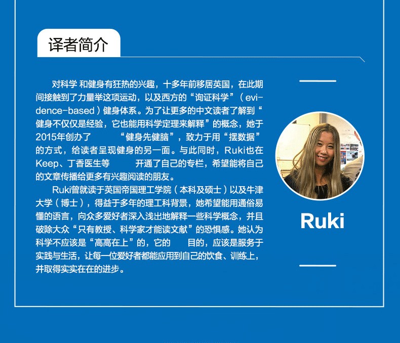 譯者簡介 Ruki 對科學和健身有狂熱的興趣,十多年前移居英國,在此期間接觸到了力量舉這項運動,以及西方的“詢證科學”(evidence-based)健身體系。為了讓 多的中文讀者了解到“健身不僅僅是經驗,它也能用科學定理來解釋”的概念,她於2015年創辦了公眾號“健身先健腦”,致力於用“擺數據”的方式,給讀者呈現健身的另一面。與此同時,Ruki也在Keep、丁香醫生等平台上開通了自己的專欄,希望能將自己的文章傳播給 多有興趣閱讀的朋友。