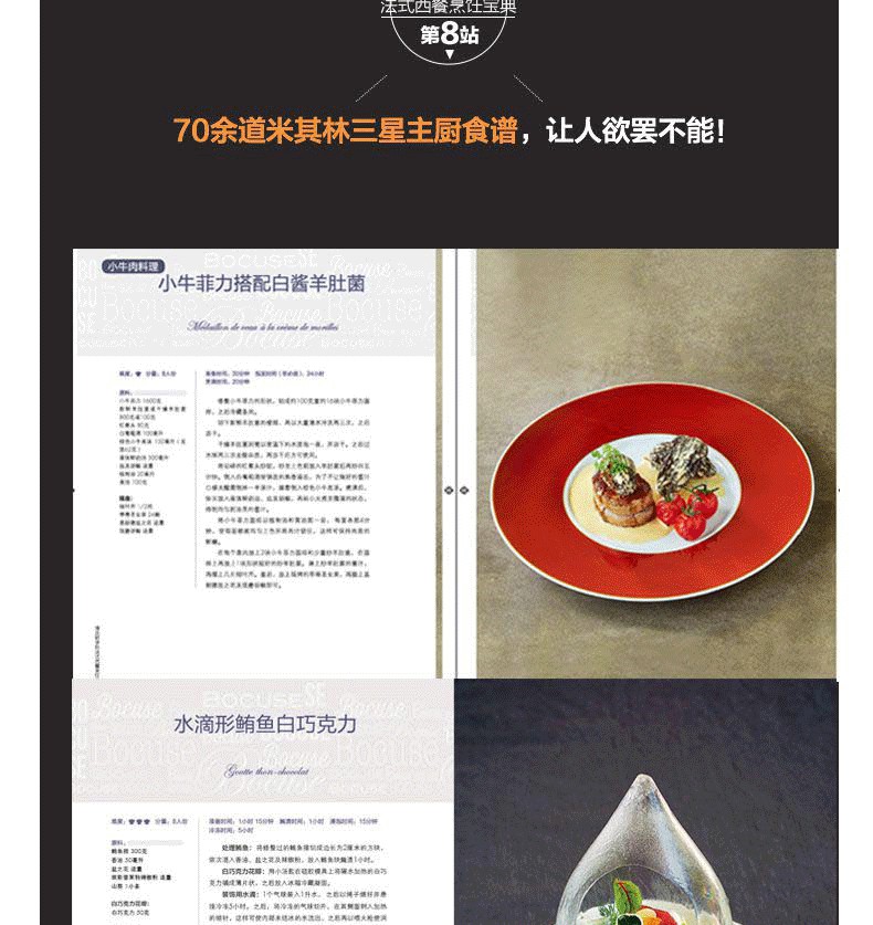 《博古斯學院法式西餐烹飪寶典》是被譽為培養“法國名廚和餐飲業管理者搖籃”的廚藝學院——法國保羅·博古斯廚藝學院的培訓課程教材。法餐教父、現代法國菜之父及米其林三星紀錄保持者保羅·博古斯親自教你做菜! 《博古斯學院法式西餐烹飪寶典》的內容主要包括雞蛋、*類、海鮮類、穀物及蔬菜等幾乎全部食材的處理方法及烹飪技巧。同時,講解了切分餐點及裝盤上菜的步驟等。 zui後,傾情獻上精心挑選的70餘道食譜的詳細的製作方法,還配有烹飪技巧及食材索引,供專業人士及美食愛好者學習和借鑒。