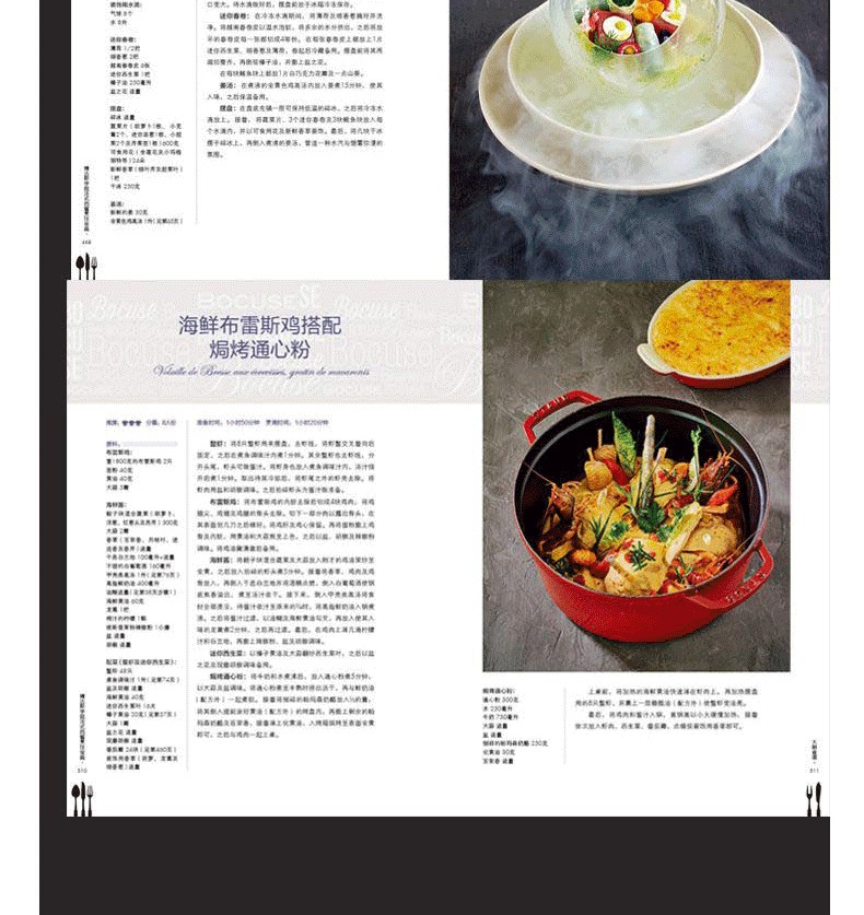 《博古斯學院法式西餐烹飪寶典》中約有70道食譜的展示,超過250種烹飪技巧的步驟說明,且全部按照食材種類詳細進行分類。 1990年,在法國當時的文化部部長傑克·朗(Jack Lang)的推動下創立了保羅·博古斯廚藝學院,他一心想將烹飪料理納入創意行業這一領域,令其變為“烹飪的藝術”,而包含豐富步驟圖的本書的出版,就是為了向這所屹立了26年之久的學院致敬。