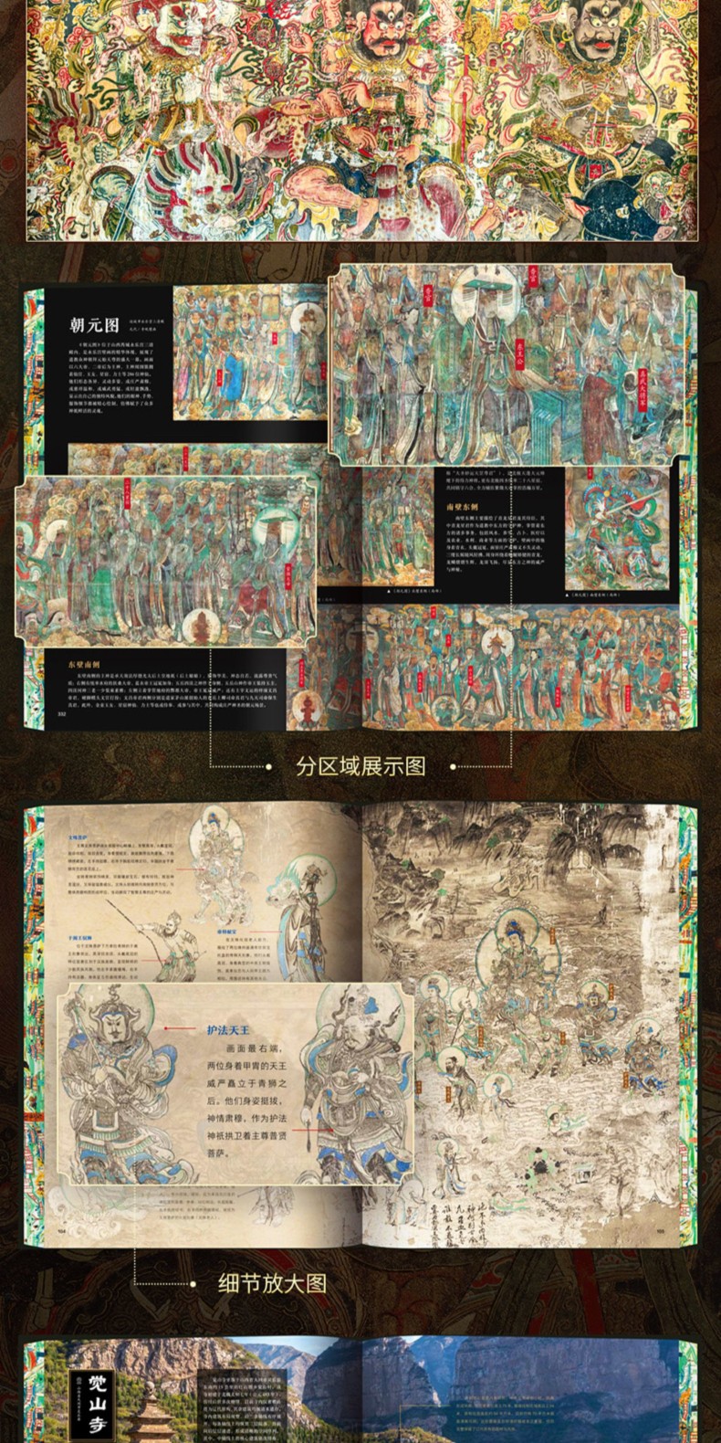 3. 1000張高清絕美插圖,搭建中國壁畫終極視覺檔案庫:既有壁畫全景圖,也有局部圖、細節圖帶領讀者近距離欣賞每幅壁畫,連壁畫斑駁的肌理,以及畫中人物的神態、衣紋都清晰可見,將東方美學展現地淋漓盡致,讓讀者在潛移默化中提升美學素養。還有多幅實拍圖、空拍圖展示壁畫的實際位置、分佈,讓讀者得以全方位、多角度觀賞中國壁畫。