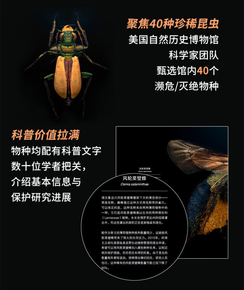 甄選牛津大學自然史博物館150年間500萬件珍藏的昆蟲標本,其中包括達爾文等時代先驅收集的珍品,由攝影藝術家列文· 比斯透過開創性的超微距攝影技術,捕捉到昆蟲前所未*的肖像。它們有著令人嘆為觀止的細節,以及意想不到的美,為我們提供了獨特的觀察體驗,堪稱自然與科學的真正奇蹟。