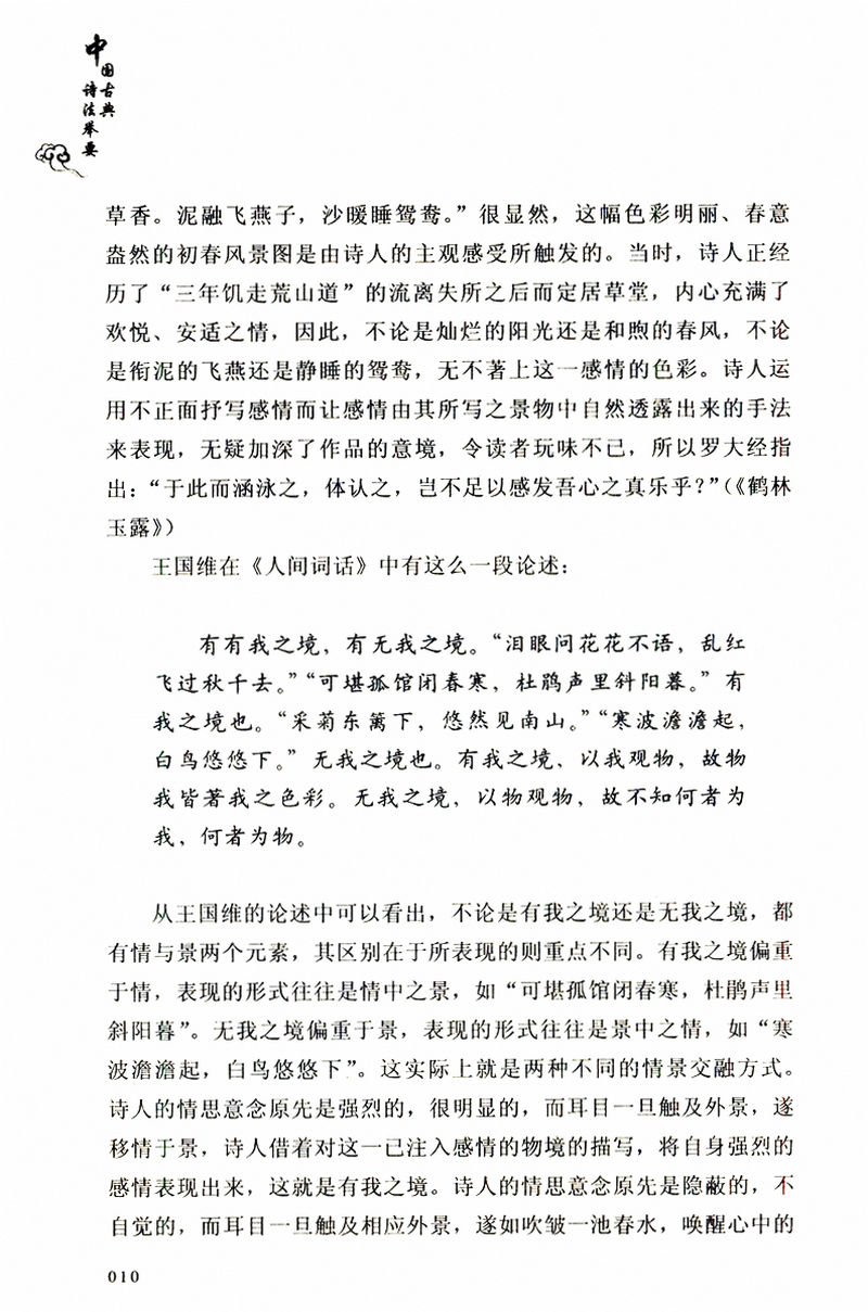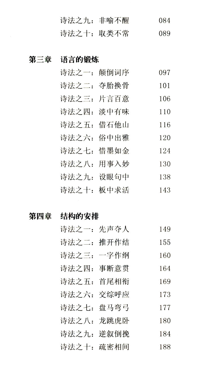 本書將詩法按感情、意象、語言、結構、詩趣、聲韻六個方面大致分類,然後分別列出細目進行論述與闡釋。在研究方法上則採用理論與實例相結合的方式,既避免從理論到理論、缺乏對具體作品分析的空洞論述,亦避免只著眼於一句一詞、缺乏理論上昇華的瑣屑之談。在剖析古人作品時,既賞其詩法精妙獨到之處,亦揭其缺陷與不足,以幫助讀者藉助這些詩歌創作的手法與技巧,真正把握詩人的藝術匠心,從而提升自己的創作水平與審美鑑賞能力。