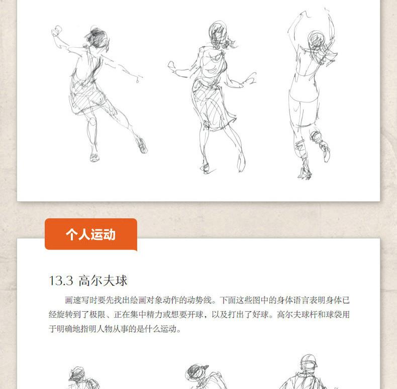 全書共17章。首先講解速寫的基礎知識和人物的動作分析;然後從不同的角度詳細地講解日常活動中的人物特徵、坐姿的畫法、玩桌上游戲的人的畫法、站姿的畫法、行走人物的畫法,以及兒童的畫法;最後按照不同專題展示特殊場合的人物的畫法、載歌載舞的人物的畫法、動物園中的人物的畫法,