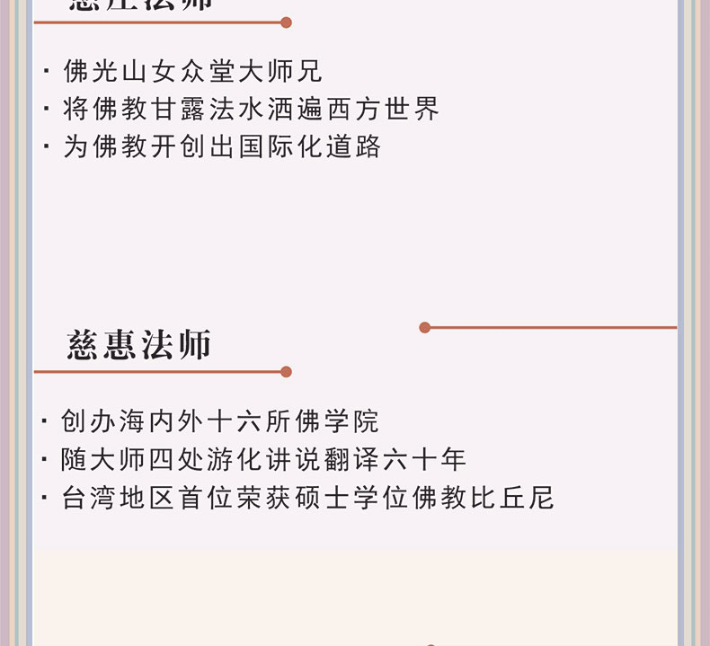 慈莊法師,宜蘭縣人,1931年生,1954年皈依星雲大師,1965年在苗栗法雲寺受三壇大戒。之後留學日本京都佛教大學,是星雲大師女眾首座弟子。 1974年開創佛光山第一座別院普門寺,旋即前往美國創建西半球第一大寺-西來寺,歷時十年完成。後來繼續致力於在世界各地開創佛光山道場的工作,先後完成數十餘所道場的開創。歷任佛光山東方佛學院院長,普門寺住持、西來寺主持等,為佛光山首席長老。