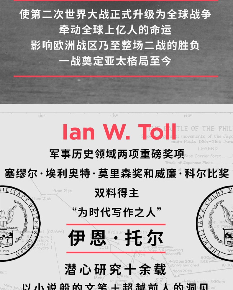 突破陸戰為主的視角,揭示航母興起和人類海戰思維蛻變的歷程 太平洋戰爭當中的海戰不僅對戰局本身起著決定性影響,也顛覆了自古以來的海戰方式,重塑了人類對海戰的理解。然而原有的太平洋戰爭經典作品往往重陸戰而輕海戰,無法真正呈現太平洋戰爭的全貌。托爾的鉅作從全面的海戰視角鋪陳開來,展示了航空母艦取代「大砲巨砲」成為海軍核心的曲折歷程,彌補了這個缺憾。