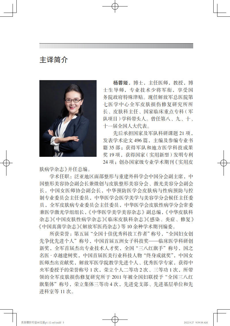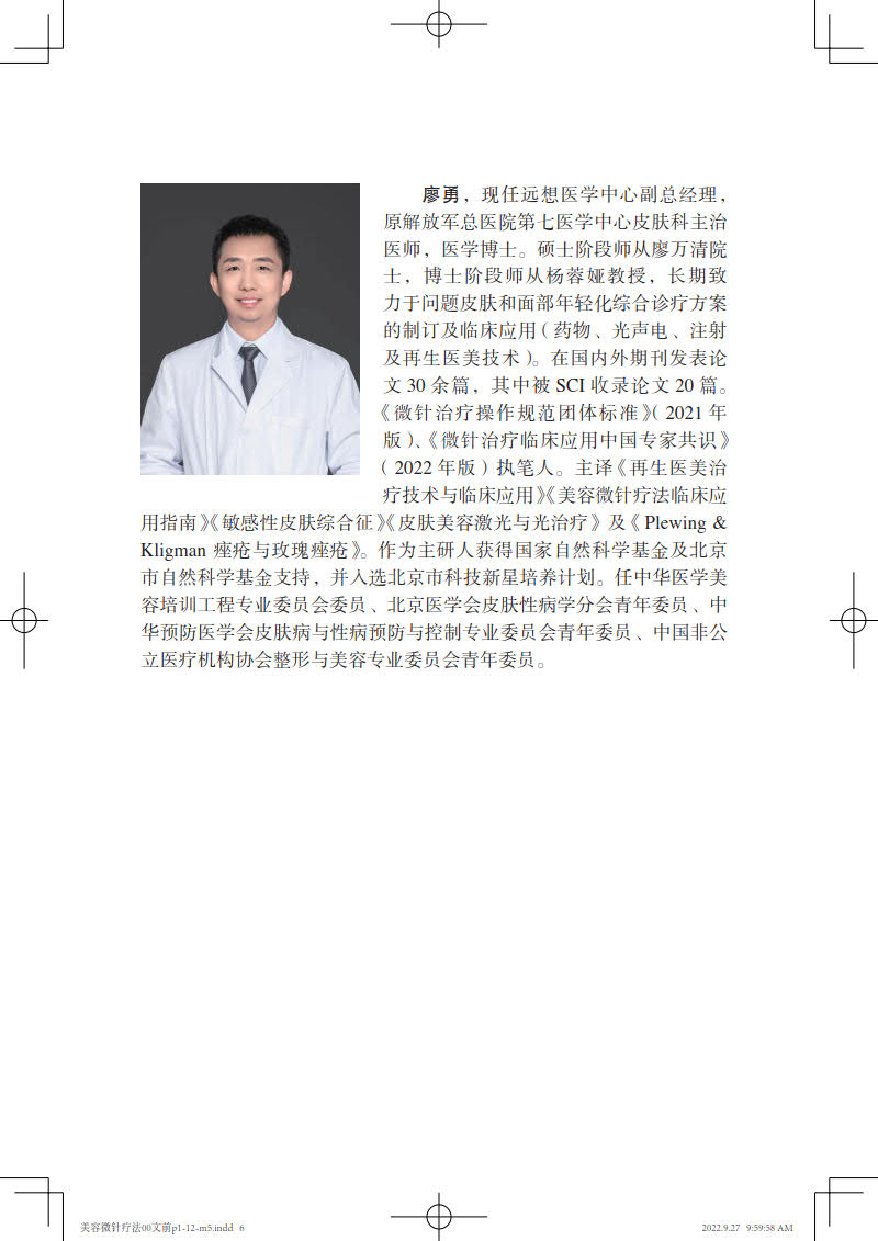 本書由Springer出版社引進,是一本關於美容微針療法臨床應用的專著。全書共30章,是作者20年微針臨床操作經驗的系統化總結,內容涵蓋各種繼發性瘢痕、皺紋、膨脹紋、皮膚鬆弛症、脫髮、橘皮組織以及黃褐斑等相關醫學美容適應證的具體治療(治療前、治療中及治療後細則)及成功案例展示,同時分享了微針療法與常用醫學美容治療手段聯合應用的相關經驗,對於廣大美容皮膚科醫師的臨床工作具有實踐指導意義,並有助於促進微針療法在國內安全、有效地使用。