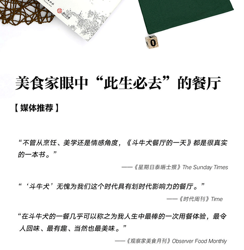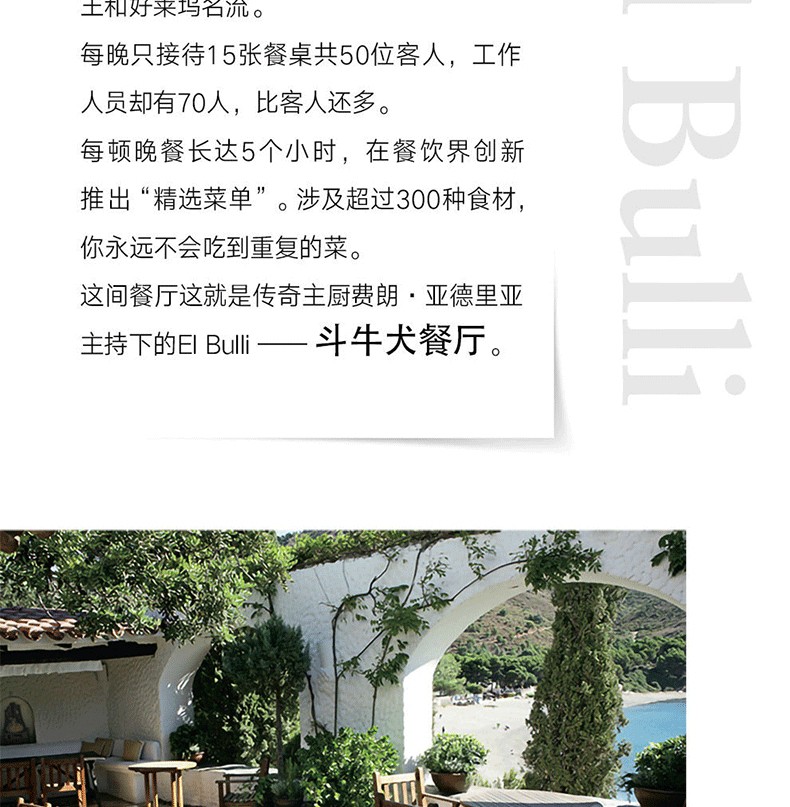 位於西班牙加泰隆尼亞玫瑰城的鬥牛犬餐廳以分子料理聞名於世,1961年開業,曾多次獲得米其林三星,並連續5年成為全球餐廳評選的榜首。這家餐廳每年接到超過200萬份預定請求,但由於其主要工作內容是菜餚創新,全年的開門迎客的時間只有160天,因此每年僅能招待約8000名食客,可謂一席難求,被追崇為“魔幻餐廳”。該餐廳於2011年歇業,隨後轉型為烹飪研究中心,延續其半世紀的輝煌。 《鬥牛犬餐廳的一天》向每位美食愛好者敞開了大門,以細膩的闡釋和壯觀的場景向讀者揭示這件傳奇餐廳內部運作,以及美食創意的奧秘。本書包含超過1000張精美照片,其中包括罕見的食譜和創意筆記,讓讀者一窺廚神團隊的創意方法和美食哲學,也看到這位烹飪大師的情感與內心。