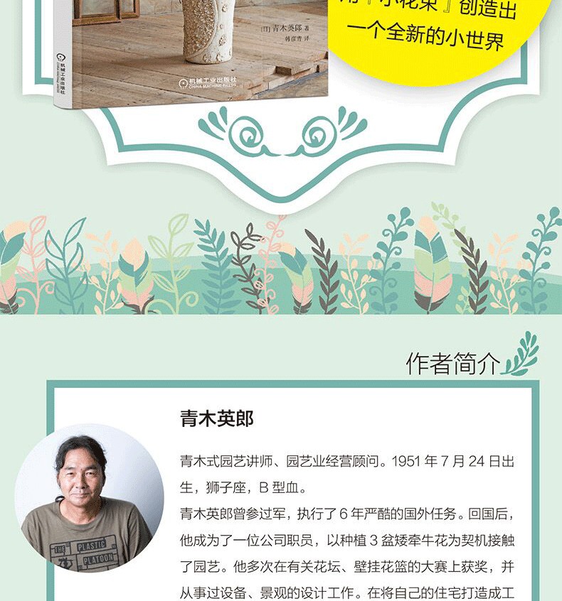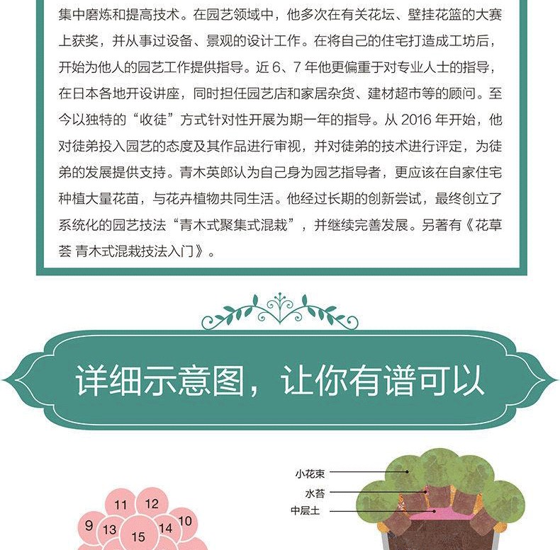 本書是繼《花草薈:青木式混栽技法入門》後,日本讀者期待的、建議出版的混栽教科書。青木英郎夢想能將混栽呈現出花藝作品的美感,於是自創了“青木聚集式混栽”,本書更系統、全面、易懂地介紹了這種使用帶根花苗打造組合盆栽的全新園藝技法。通過5種不同類型的作品——單個小花束、花環、花盆、壁掛花籃、帶根花束,告訴你更多的園藝方法,用更詳細的高清多角度步驟圖和示意圖,手把手教你使用“小花束”創造擁有細膩表現的作品。而當這些小花束長得“變形”時,通過調整和重組即可修正或誕生出新的作品。另外,書中還附大量青木英郎監督創作的充滿個性的作品,可供讀者參考欣賞。
