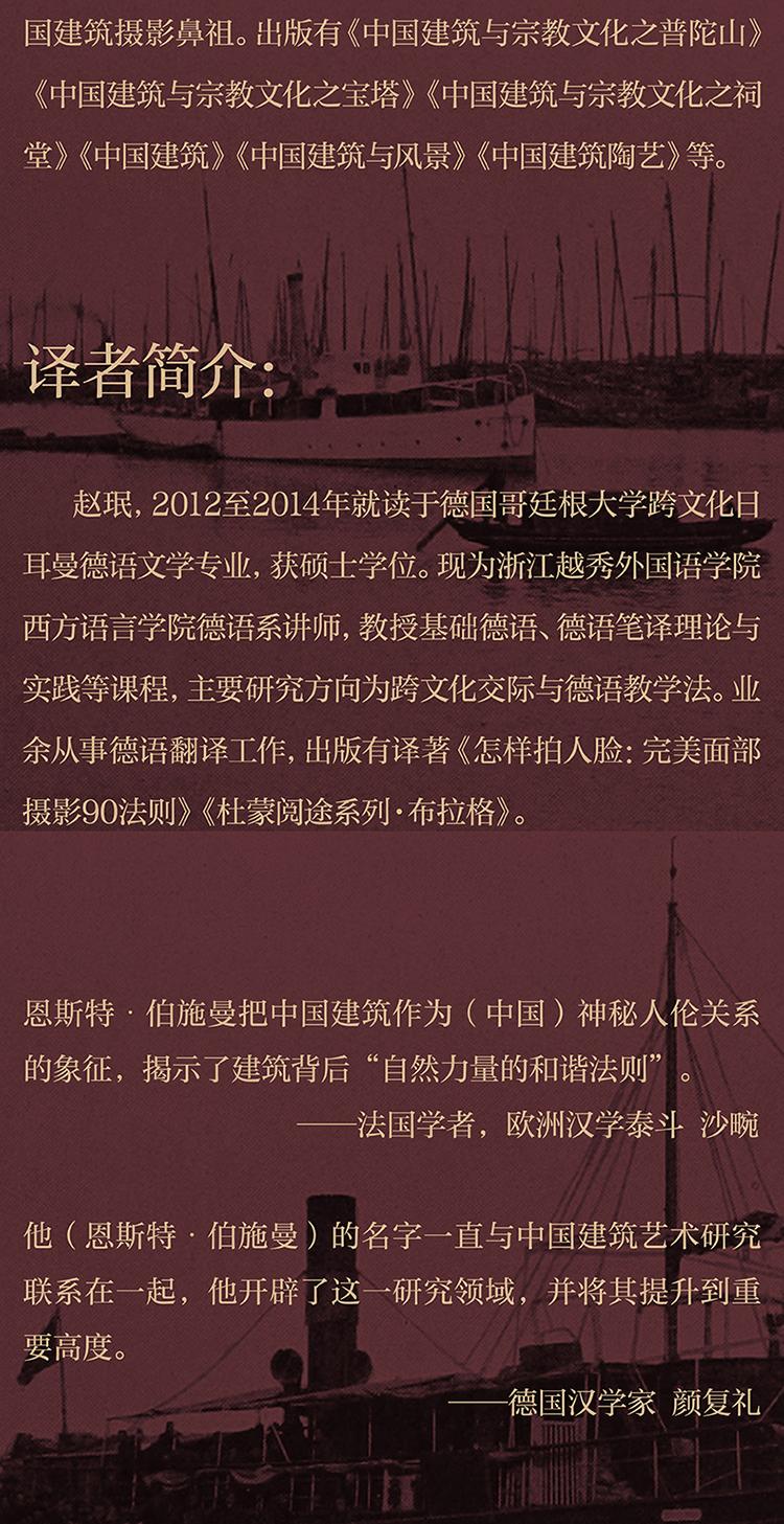 恩斯特·伯施曼(Ernst Boerschmann,1873-1949),德國皇家柏林工業高等學院(柏林工業大學前身)教授,中國建築攝影鼻祖,全面考察和記錄中國古代建築的第一人。 1906年至1909年間,在德意志帝國皇家基金會的支持下,伯施曼跨越14省,行程數万裡,對中國的皇家建築、寺廟、祠堂、民居等進行了全方位的考察,留下了8000張照片、2500張草圖、2000張拓片和1000頁測繪記錄。 1932年,伯施曼受邀成為中國營造學社的通訊研究員。 1933年至1935年間,被特聘為中國傳統建築遺產顧問。出版有《中國建築》《中國祠堂》《塔》《普陀山》等作品。