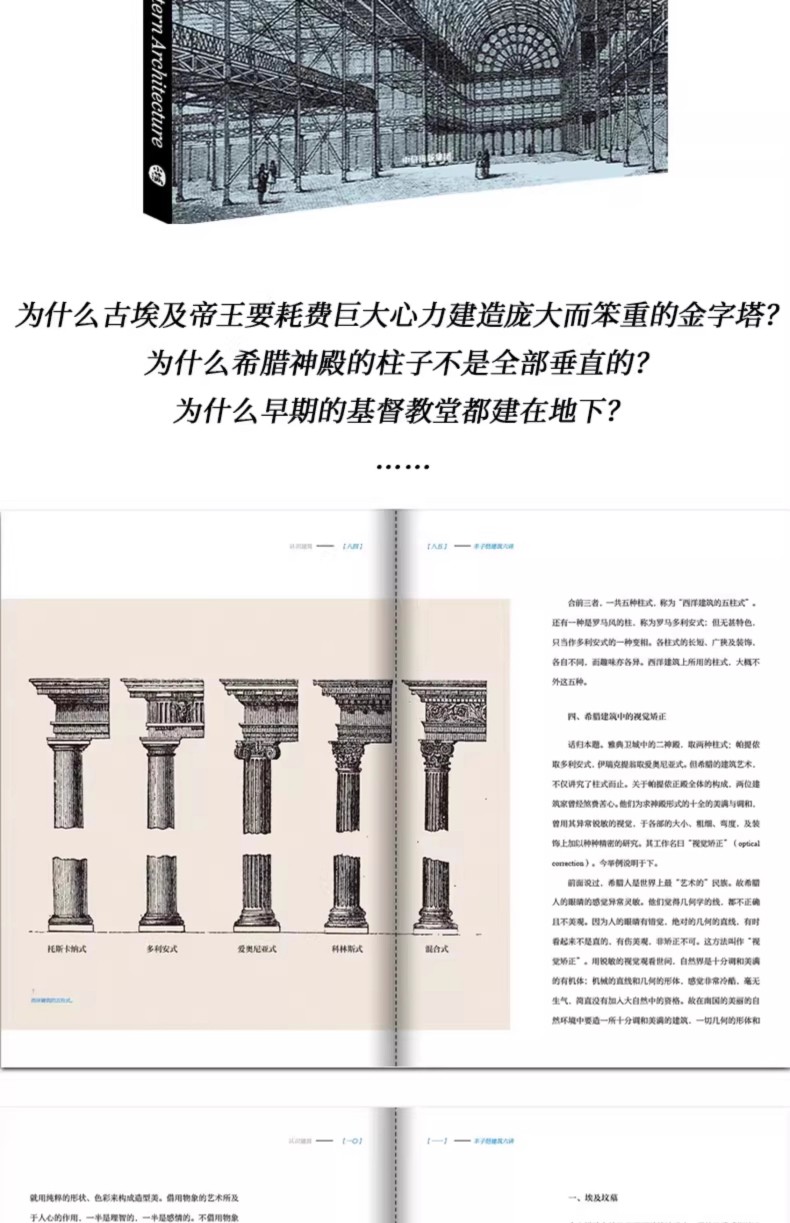 《認識建築》在《西洋建築演講》(1935年)的基礎上編輯而成,新版增添圖百餘幅。為什麼古埃及帝王要耗費巨大心力建造龐大而笨重的金字塔?為什麼希臘神殿的柱子上有一道細溝?為什麼早期的基督教堂都建在地下?全書對古今建築藝術發展做了全面梳理,以豐富實例和深入淺出的講解,融會貫通地揭示了建築背後的文化與藝術變遷。豐子愷先生在書中提到,“建築是時間的載體,它不僅為人類提供了棲身之所,更承載著時代精神與文化的氣息”,豐子愷憑藉自己深厚的藝術積淀,將建築的發展與經濟、政治、宗教、文化的發展關係細細分析,娓娓道來。