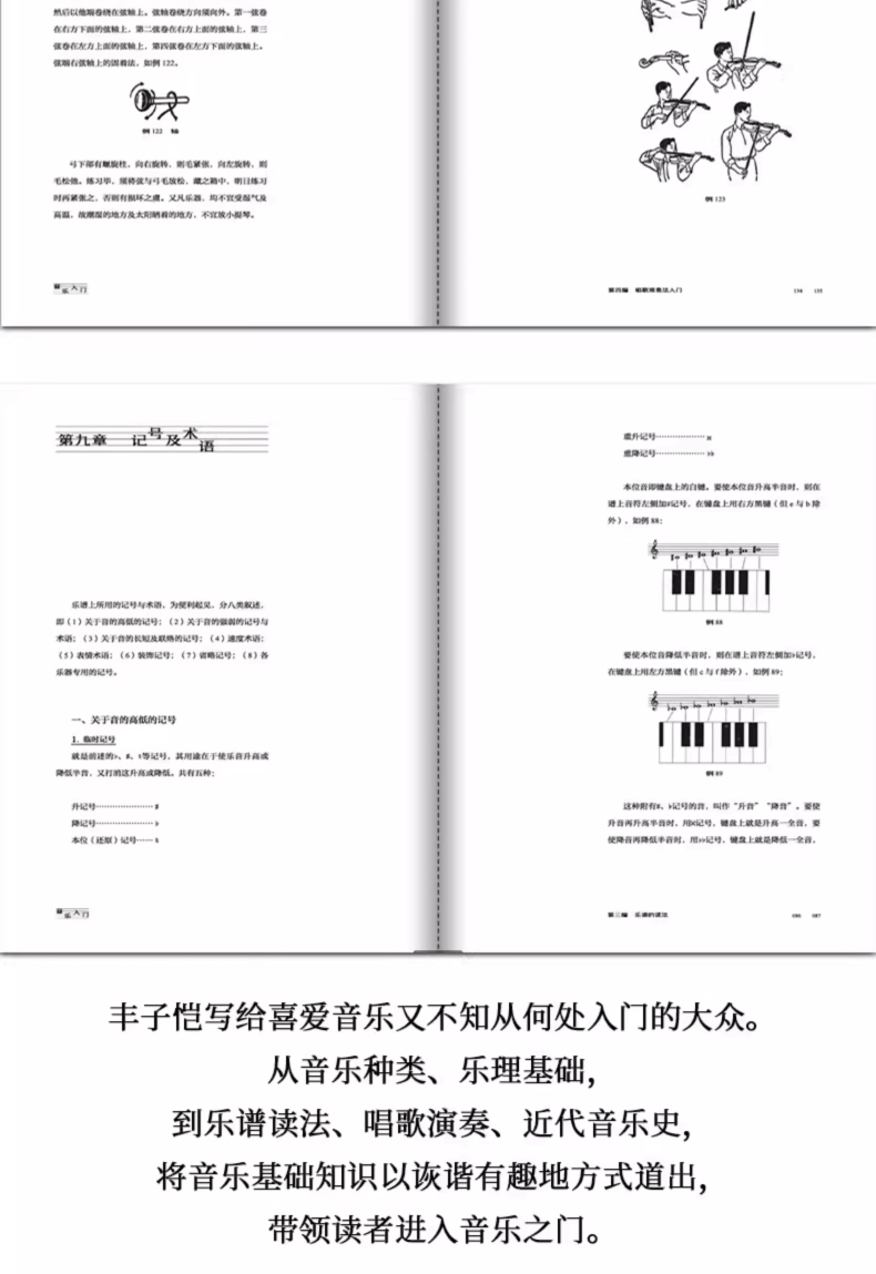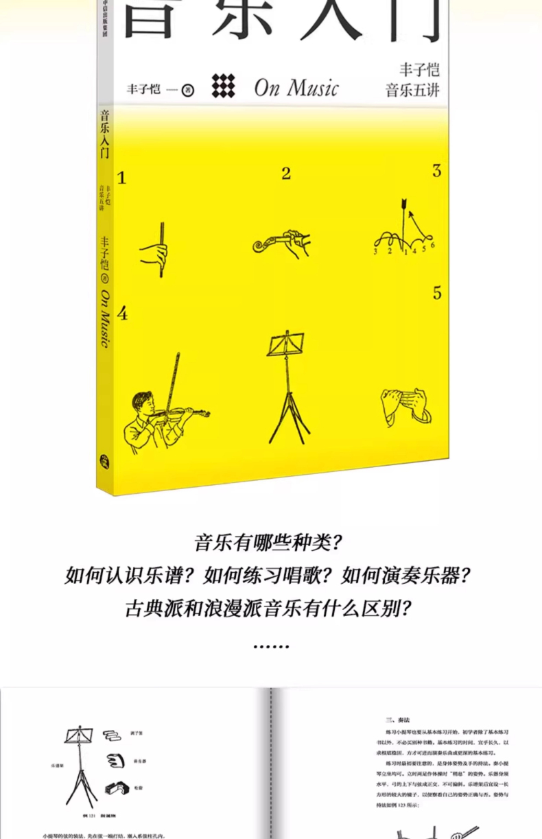 《音樂入門》源自《音樂入門》(1926年)和《藝術修養的基礎》(桂林社1941年)兩本書,在尊重豐子愷行文風格的基礎上,對文章做了適當調整,以便當下讀者更能理解豐子愷先生的藝術世界。音樂有哪些種類?音樂入門要經歷哪三個階段?如何認識樂譜?如何練習唱歌?如何演奏鋼琴、小提琴、口琴等幾種常見樂器?西方音樂是沿著怎樣的道路發展至今的……在本書中,豐子愷先生將針對這些問題,用通俗淺顯的語言和生動形象的圖解一一作答,為我們打開一扇通往音樂殿堂的大門。講述樂理基礎、古今中外音樂風格、音樂家、樂器、作品……兼顧美感與實用性,以通俗語言帶領讀者入門欣賞音樂藝術。