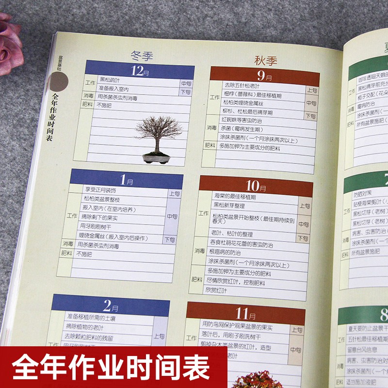 全書介紹了盆景的基礎知識,包括普通盆栽與盆景的差異,盆景的種類,盆景的基本樹形,製作盆景的工具,使用的盆土、盆器與幾架,盆景的陳設方法;盆景的基礎管理與養護方法,包括放置地點、澆水、施肥、防治病蟲害,移栽準備與方法,鋪種苔蘚,覆蓋盆土,蟠扎,養護,繁殖等;常見樹木盆景製作方法,包括松柏類、雜木類、觀花類、觀果類、草本類等74種備受追捧的盆景作品步驟圖解。