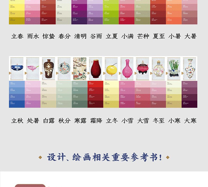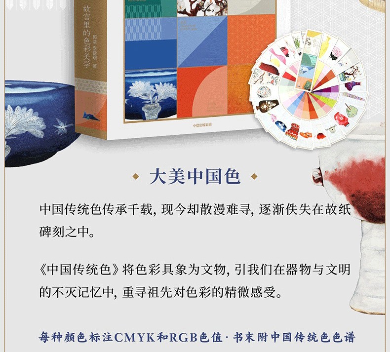 本書展現了的中國色彩文化傳承,讀之重獲中國傳統色之美。中國古代漢語中顏色詞的豐富代表了華夏文明的進化高度。豐富的顏色詞由詩詞、典籍、史書、字書、藥典、佛經等傳承至今,但散漫難尋,《中國傳統色》梳理、歸納384種中國傳統色色名,有據可查,有典可尋。又從十幾萬件故宮館藏文物中,根據24節氣72物候精選96件應時應節應色的文物,以手繪方式複原、呈現文物被磨損的色彩,提取中國傳統色色譜。