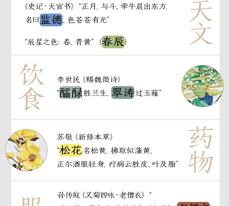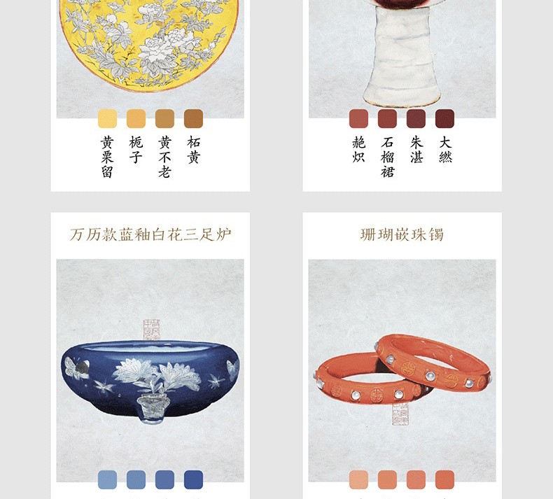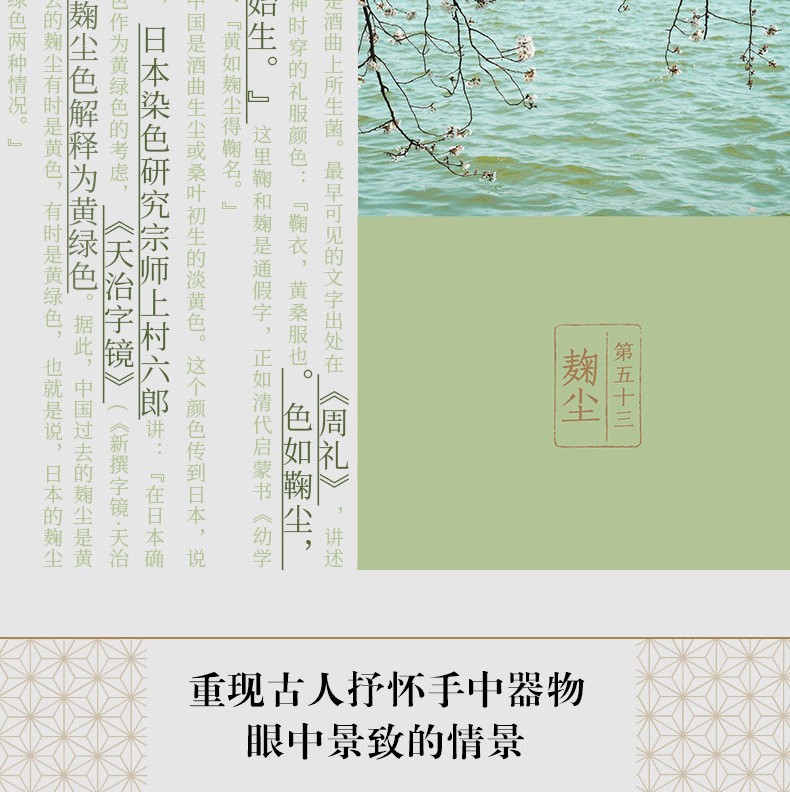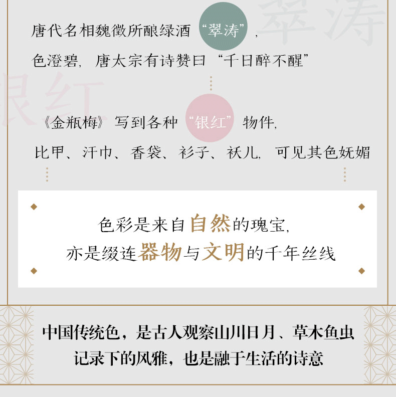 ★通過色彩感受文學作品的瑰麗。 《紅樓夢》中黛玉穿“月白繡花小毛皮襖”“楊妃色繡花錦裙”是怎樣的風姿?李白寫下“日照香爐生紫煙”時,香爐上升騰的紫煙是怎樣的虛渺?通過書中呈現的顏色,能夠得到直接的答案。影視作品中展現的色彩,也能在書中得到考證,觀影閱讀,兩相對照,更增一分樂趣,比如《延禧攻略》採用的“乾隆色譜”,確有其事:月白、官綠、水紅等色在書中都有收錄。
