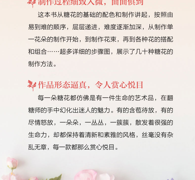 糖花作為翻糖的一個門類,以其逼真、美觀的表現形態,成為蛋糕裝飾推薦的方法與技巧。本書中花型豐滿、顏色各異的繡球花,花姿豐盈、端莊高雅的山茶花,雅緻清新、自由快樂的波斯菊,玉笑珠香、富麗堂皇的牡丹以及充滿浪漫氣息的薰衣草……這些色彩鮮明、形態逼真的糖花盡情“綻放”,在蛋糕裝飾上大放異彩。除了蛋糕裝飾,還特別介紹了婚禮蛋糕的裝飾方法,給人以聖潔而愉悅的感覺,是一本非常實用的糖花裝飾蛋糕的工具書。